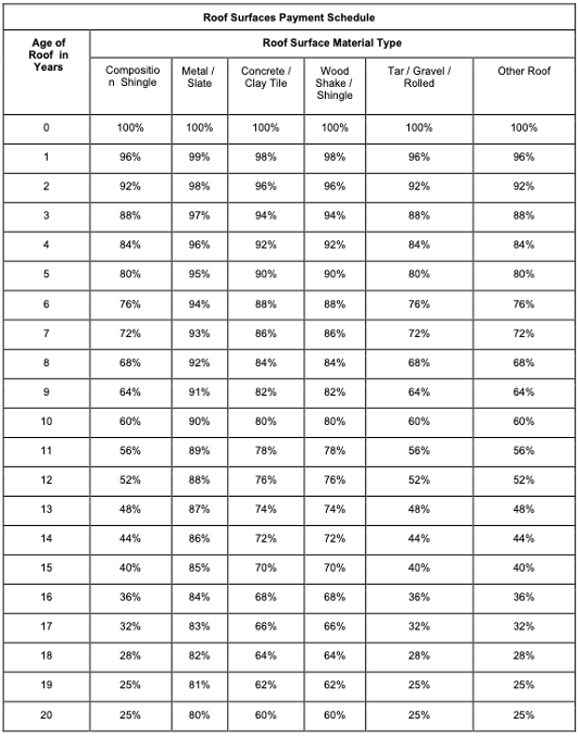 The Roof Surfaces Payment Schedule shows how ACV roof coverage decreases as the roof ages.